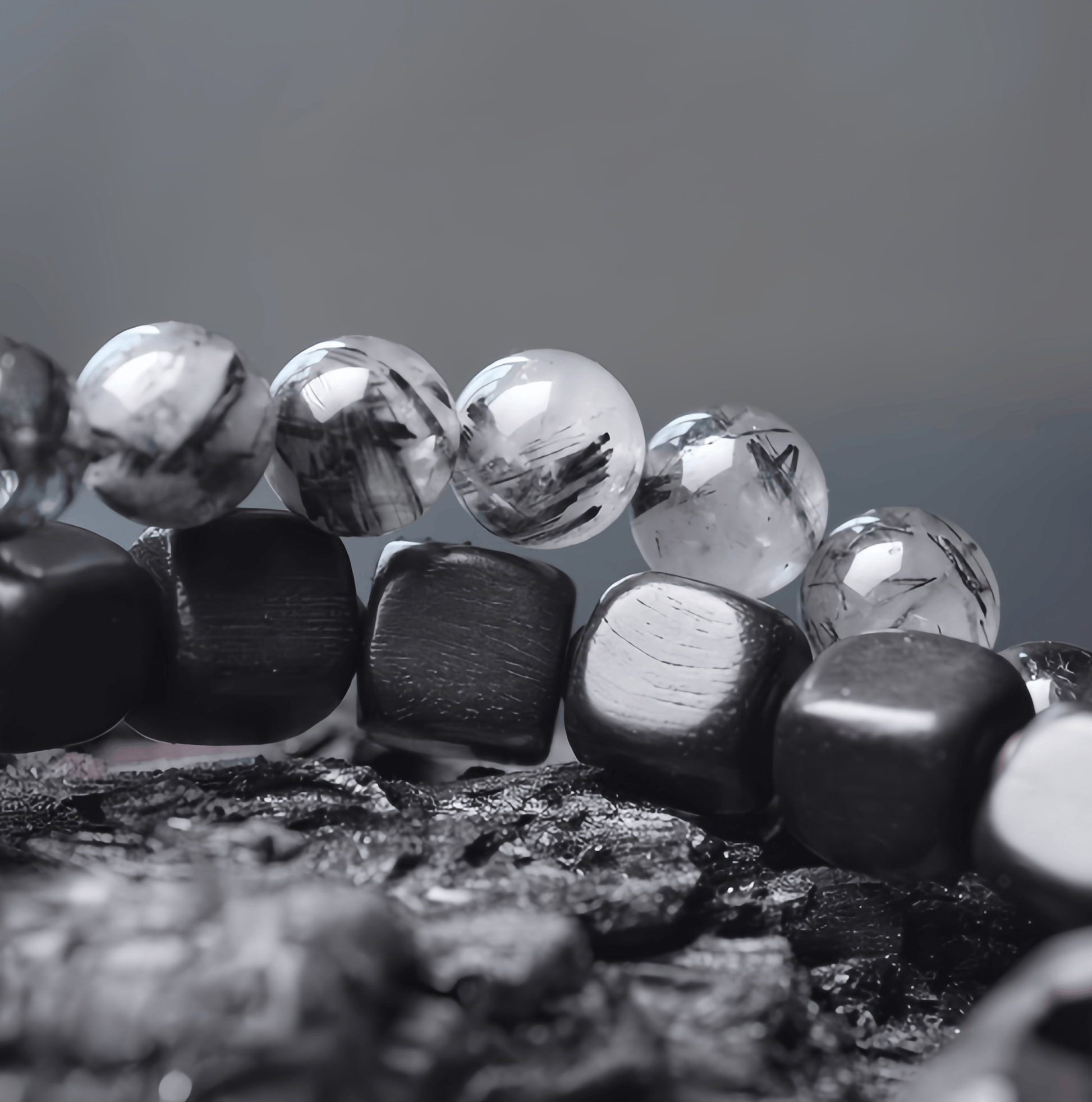 Energy Luxury Artisan Mixed Black Rutilated Quartz & Ebony Wood Bracelet – Handcrafted & Symbolic